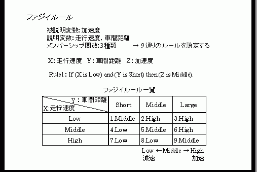 次に,ファジイルールについて説明します。被説明変数として加速度,説明変数として走行速度と車間距離,メンバーシップは3種類としました。したがって,9通りのファジイルールを設定する必要があります。走行速度をX,車間距離をY,加速度をZとしますと,ルール1は「もし,走行速度が小さく,車間距離も短ければ,加速度は普通である」というルールです。その他のルールはこの表の通り設定しました。こちら側が走行速度,こちら側が車間距離となっています。